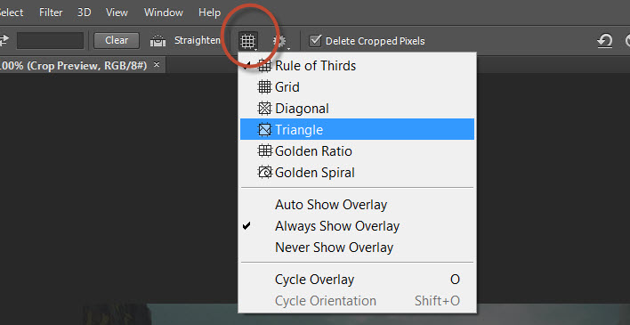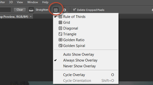 Click Rule of Thirds or the overlay you would like to choose –> Select the correct overlay pattern form the drop down menu. In the screenshot below I have selected the grid Pattern. Shortcut –> Press the letter “O” for the keyboard to toggle though the various overlays list.