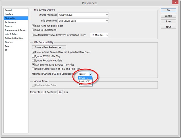 This technique is very useful for obtaining a low sized PSD. What does “Maximize Photoshop Compatibility” do is that whenever a PSD image is saved and your “Maximize Photoshop Compatibility” is turned on it also saves a flattened version of all the layers. This renders our PSD compatible with the older versions of Lightroom, Photoshop, InDesign and many other applications. But leaves us with a increased PSD size. Now since you have the newer version of Photoshop there is no use if turning on “Maximize Photoshop Compatibility” as you might be saving the PSD for your own personal use. How do you turn off “Maximize Photoshop Compatibility” Go to Edit àClick Preferences à Click File Handling and then modify the “Maximize PSD and PSB Fie Compatibility” to Never.